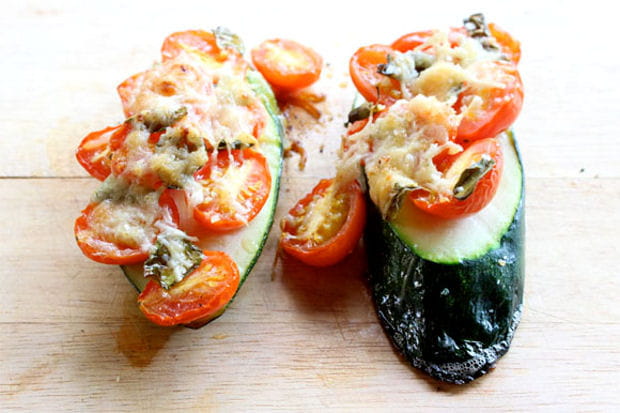 4. La pizza sur courgette en 5 minutes : cette recette convient aux végétariens et ne contient pas de pâte à pizza. Prenez des courgettes (zucchini en italien) que vous coupez en tranches épaisses et en biais. Posez sur le légume des tomates cerises en tranches, de l'origan frais, salez et arrosez d'un filet d'huile d'olive. Passez au four à 220°C pendant 10 minutes sur une plaque légèrement huilée. Sortez les courgettes du four et ajoutez du parmesan râpé. Remettre au four jusqu'à ce que le fromage soit fondu. Servir immédiatement.