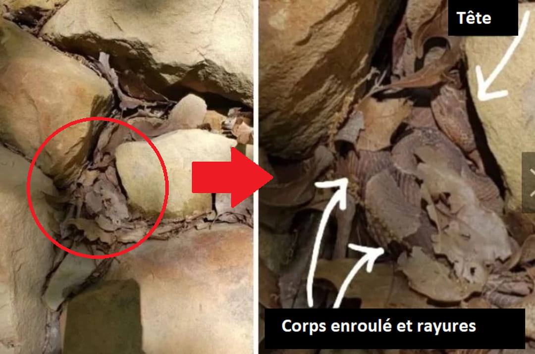 Le serpent à tête de cuivre est caché à gauche du caillou, enroulé dans les feuilles mortes. On voit sa tête bloquée contre le caillou tandis que son corps est enroulé, seulement trahi (ou masqué ?) par ses rayures. Vous nous avez demandé un jeu difficile, vous l'avez eu ! Si vous n'avez pas trouvé, demandez à vos amis d'essayer à leur tour pour voir s'ils sont capables de vous battre. Pour cela, cliquez ici pour marquer leurs noms en commentaires de notre post Facebook.