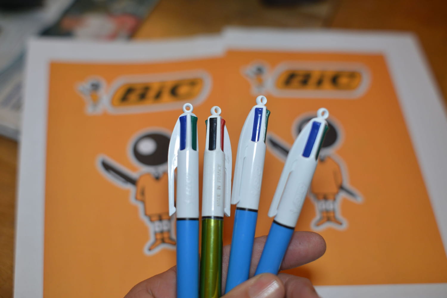 Stylos à encore, porte-mines, colles, gommes, compas, ciseaux, mais aussi carnets et agendas, Bic est aujourd'hui devenu l'une des plus grandes entreprises françaises. Habituellement vendu 1,99 €, le 4 Couleurs classique est par ailleurs au cœur de nombreuses collaborations avec des artistes ou des clubs de sport. L'édition en bronze plaqué ruthénium, imaginée par le sculpteur Richard Orlinski et la bijouterie Tournaire est même vendue pour la modique somme de 420 euros. Rien que ça...
