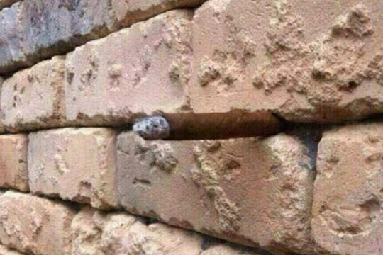 Arron Bevin, un utilisateur de Facebook britannique, a partagé ce lundi sur son profil public l'illusion d'optique ci-dessous, qui, de prime abord, semble représenter un banal mur de briques. Si vous observez avec attention le centre de la photo où est positionné ce qui ressemble à un caillou en son centre, vous allez découvrir un tout autre objet :