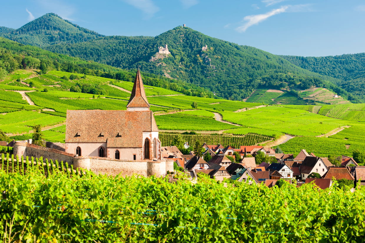 Sur la route des vins d'Alsace se trouve également le village de Hunawihr. Son église du XVe siècle émerge parmi les vignes verdoyantes.