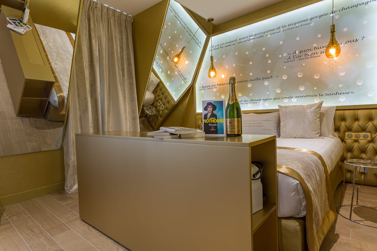 Boutique Hôtel du Quartier Latin, Les Bulles de Paris nous invite à une immersion pétillante au cœur du Champagne, qu'il soit brut, millésimé, Blanc de Blancs, rosé… Ici les bulles sont reines et chaque chambre raconte une histoire de champagne ou l'histoire d'une grande maison. L'hôtel dispose également d'un bar à champagne avec 40 références issues de 34 grandes maisons et petits producteurs. A partir de 217 € par nuit.