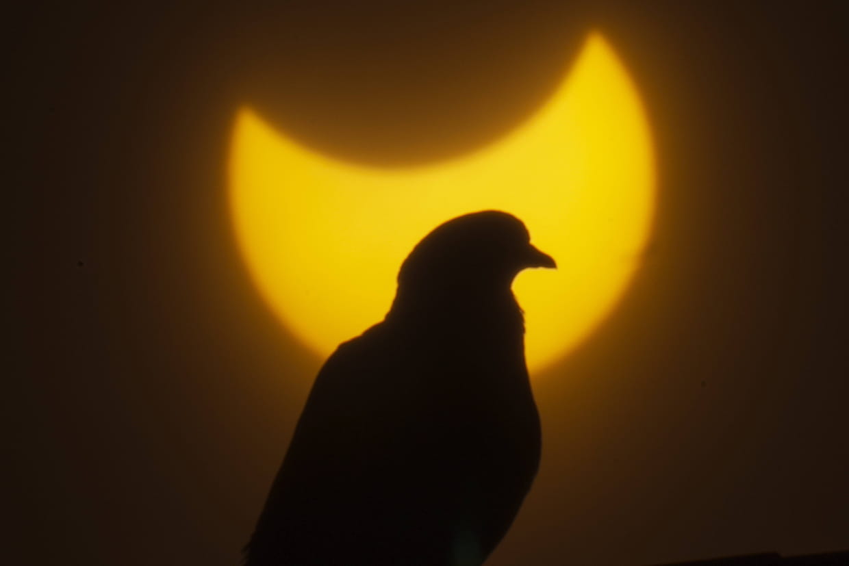 Un oiseau se profilait contre le Soleil alors que la Lune en masquait une partie lors de l'éclipse solaire partielle au centre-ville de Beyrouth, au Liban, le 25 octobre 2022.