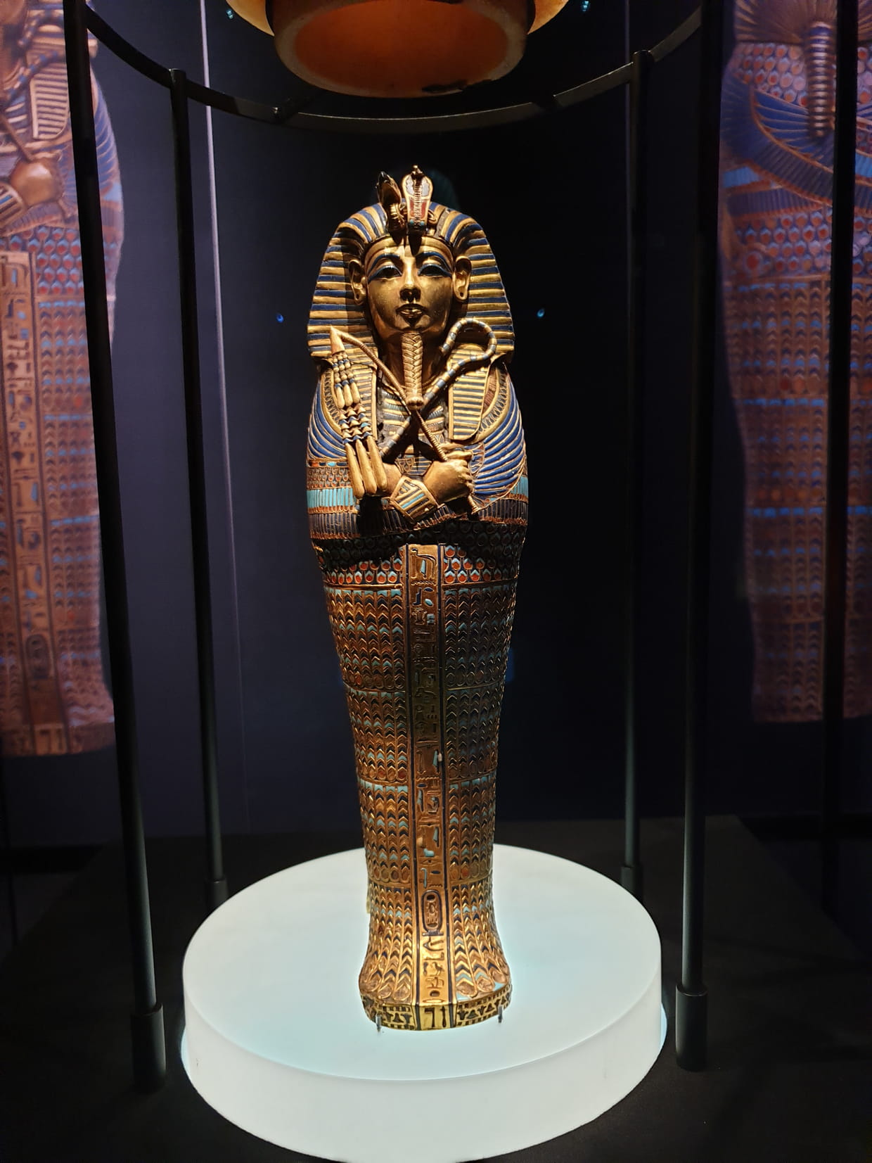 Toutânkhamon avait quatre cercueils miniatures à son effigie, placés dans un coffre en calcite. Lors de la momification, les viscères furent traitées séparément du corps, embaumés, oints d'onguents et résines, enveloppés de bandelettes de lin puis placés dans ces canopes. Le cercueil miniature à l'image était réservé au foie, organe placé sous la protection de la déesse Isis et du génie Amset.