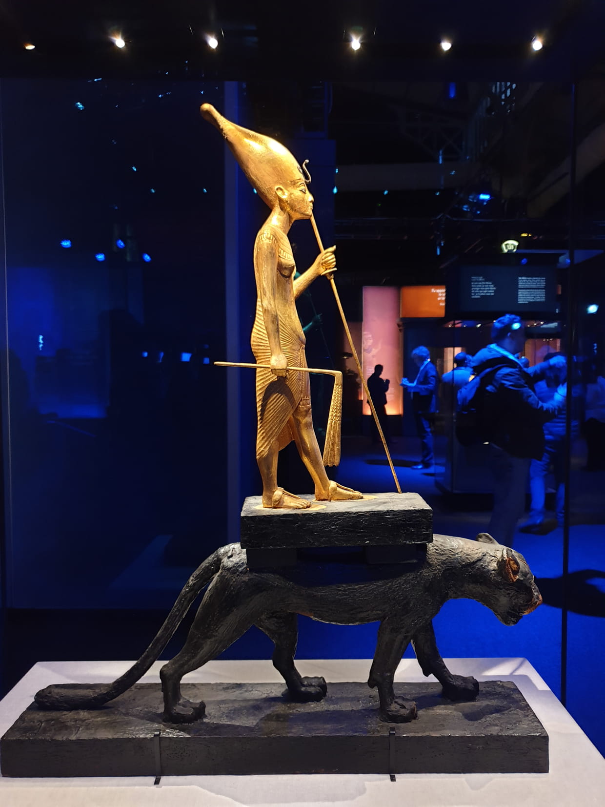 La panthère noire vernie transporte la statuette en bois doré du pharaon en lieu sûr dans les méandres du monde des morts. La panthère représente Mafdet, une divinité protectrice de l'astre solaire lors du parcours nocturne.