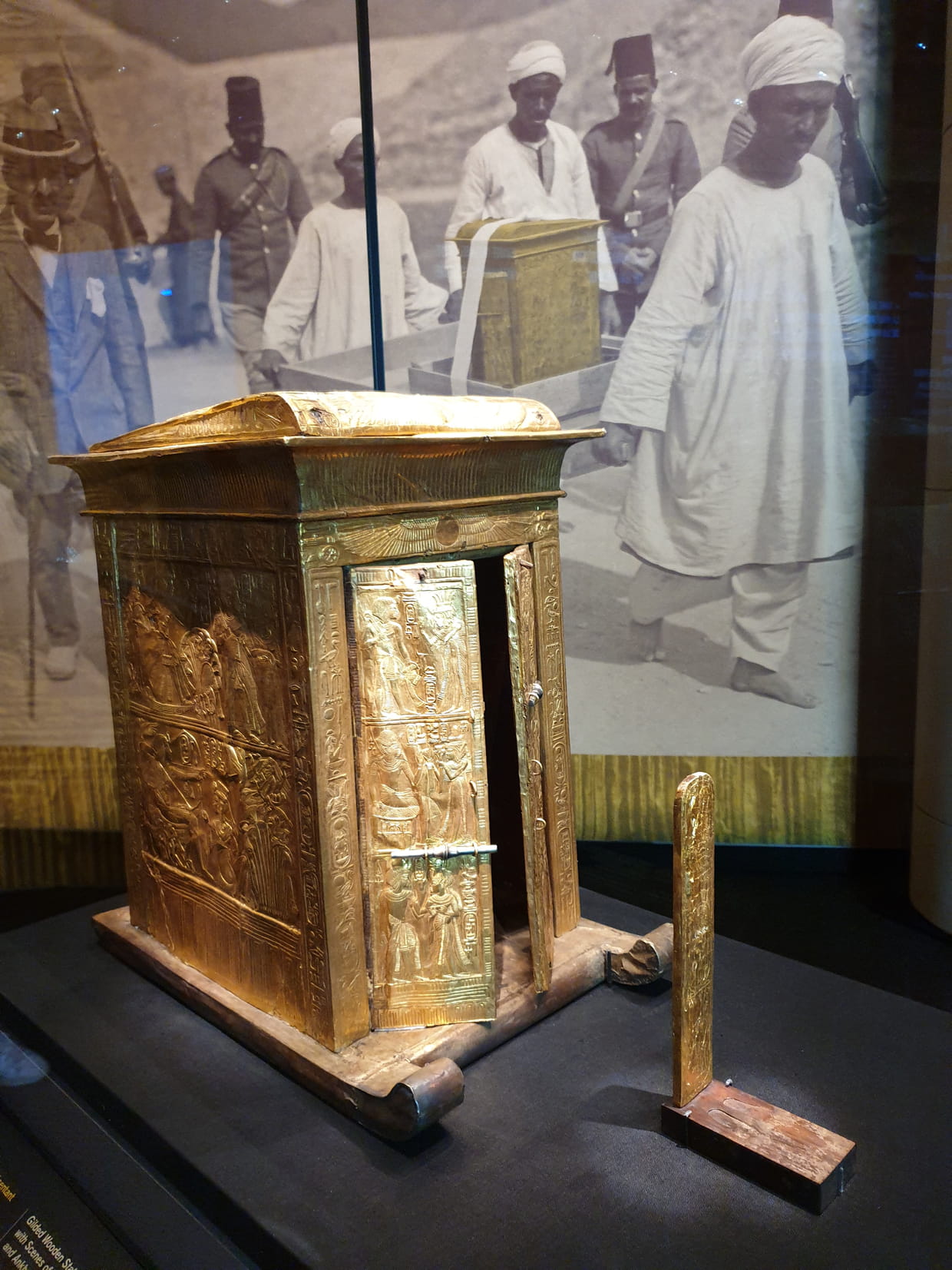 Ce naos en bois doré représente des scènes de la vie de Toutânkhamon et d'Ânkhésenamon.