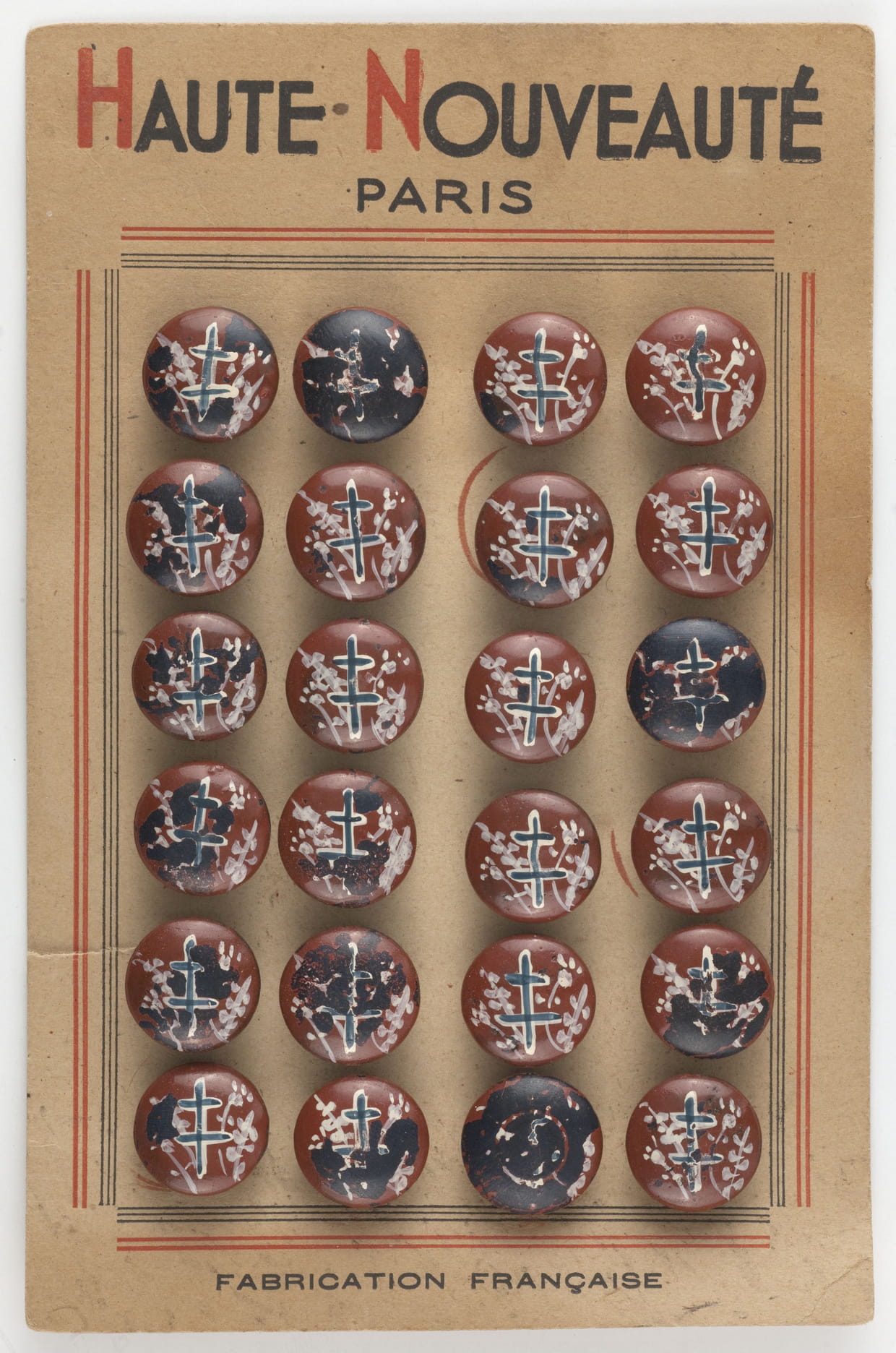 La croix de Lorraine est un symbole de la résistance lors de la seconde Guerre Mondiale. A l'image, une plaquette de 24 boutons à croix de Lorraine datée de 1944.