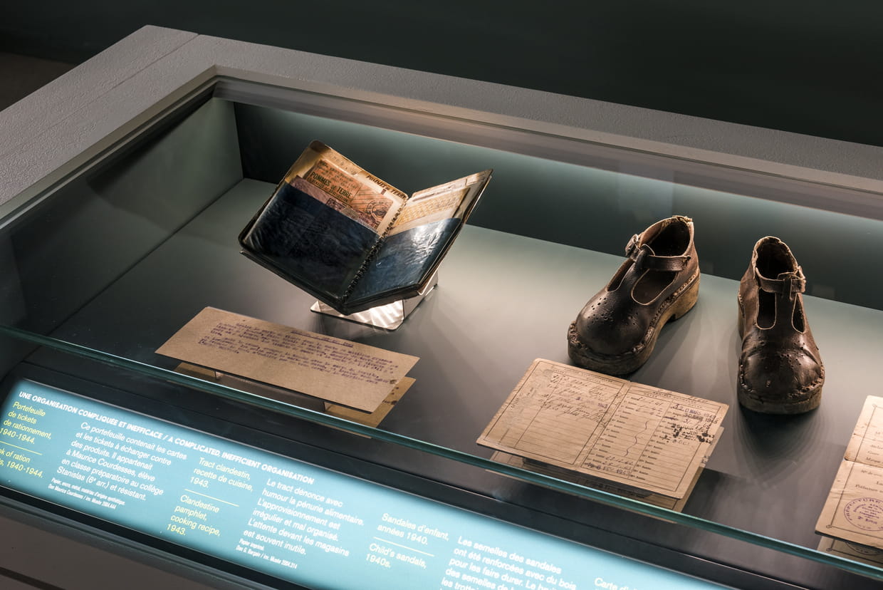 La France occupée représente une partie importante du musée. Les difficultés de la vie quotidienne sont rappelées par les tickets de ravitaillement et la pénurie est représentée par des sandales d'enfants usées.