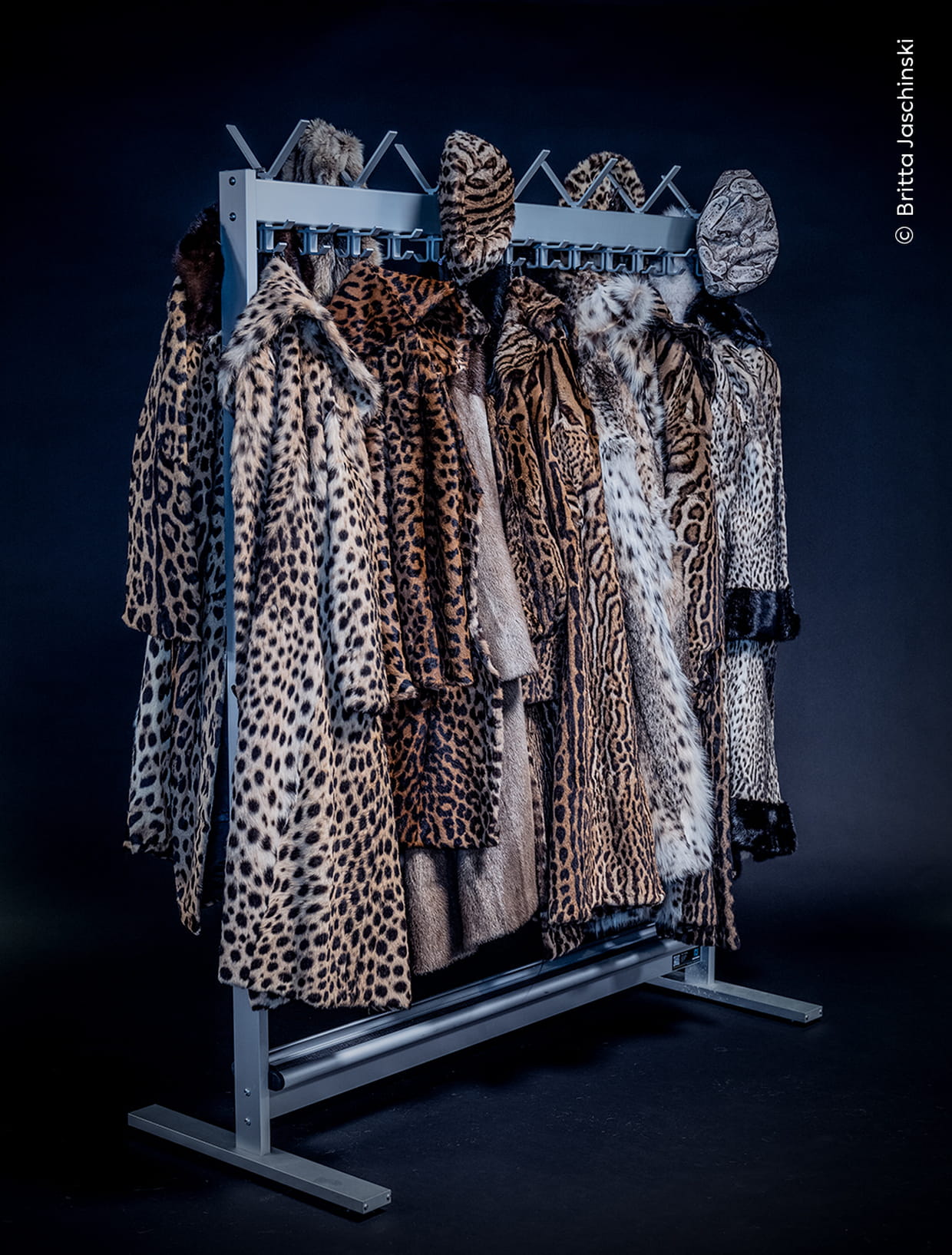 Ces manteaux, fabriqués à partir de peaux de félins parmi les plus menacés, ont été confisqués par les douaniers européens et retenus pour des tests médico-légaux avant d'être conservés à l'institut Leibniz de Hambourg à des fins d'éducation et de recherches. Lors de la séance photo, Britta Jaschinski a appris qu'en moyenne l'industrie de la fourrure utilise 12 animaux pour fabriquer un manteau. Avec l'aide d'un biologiste, elle a tenté de déterminer le nombre de félins tués pour produire les articles de mode de cette image, mais ils ont arrêté de les compter, car c'était trop choquant...