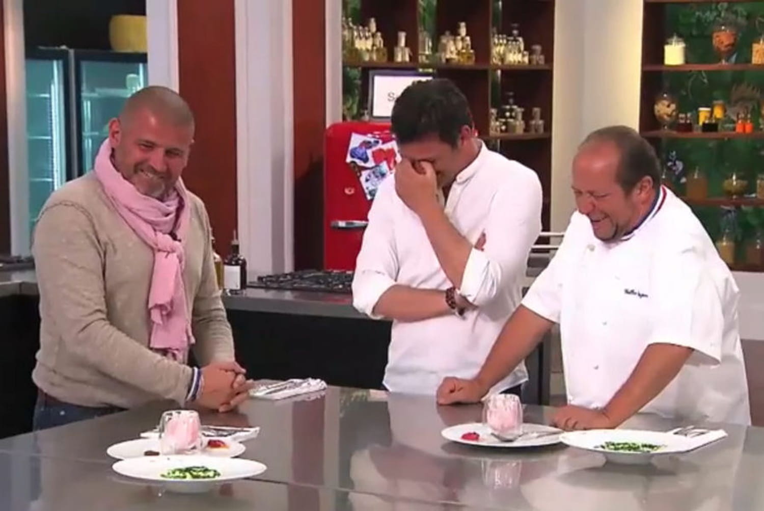 Entre deux épreuves, les chefs Christian Etchebest, Yannick Delpech et Gilles Goujon prennent du bon temps ! Les jurés de Masterchef 2015 semblent d’ailleurs très proches depuis qu’ils ont collaboré ensemble dans le concours culinaire de TF1. On notera d’ailleurs que Gilles Goujon et Christian Etchebest ne sont pas les derniers lorsqu’il s’agit de s’amuser, mais aussi de chambrer. On espère quand même que les candidats ne sont pas présents lorsqu’ils commencent à exploser de rire.