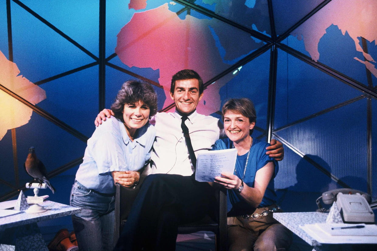 Jean-Pierre Pernaut anime également plusieurs émissions dès les années 1980. Il pose ici en 1986 avec Marianne Mako et Marianne Morance, lors du tournage de "Transcontinental" sur TF1, une émission de reportage magazine sur le voyage et l'évasion diffusée dans l'après-midi.
