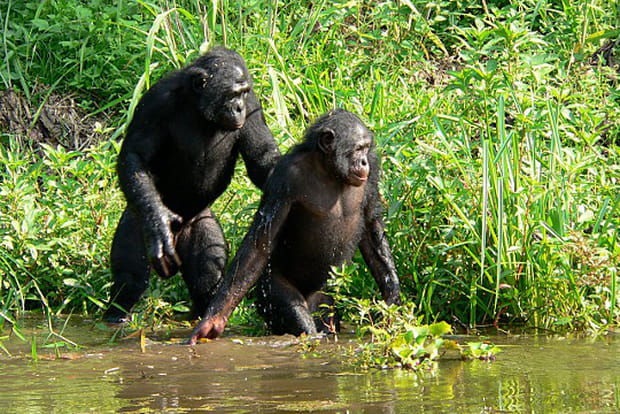 Les bonobos du sanctuaire ont naturellement peur de l'eau. Impossible de les relâcher dans ces conditions ! Les bénévoles les incitent donc à tenter d'entrer dans le grand bain. Certains s'y plaisent immédiatement, mais d'autres ont beaucoup plus de mal.