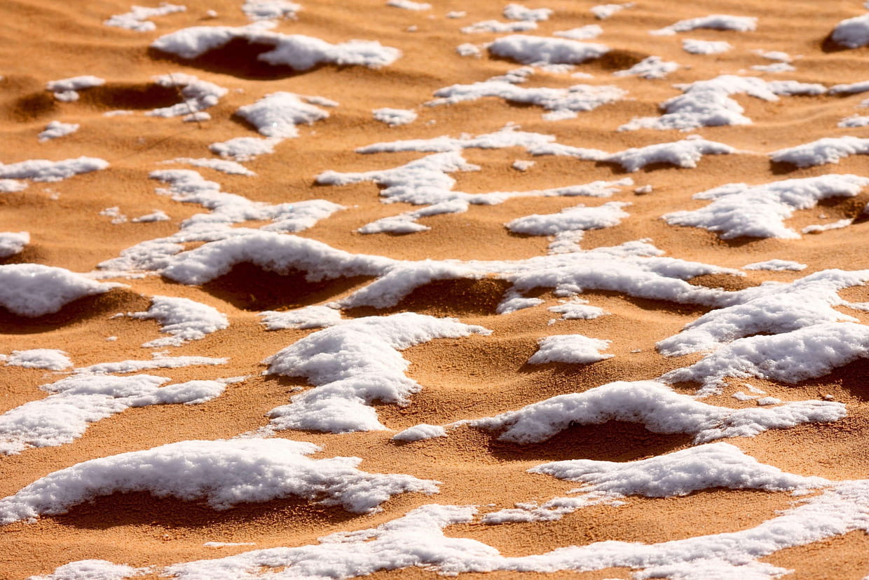 Une tempête de neige sur la planète rouge ? Même si ce paysage est digne d'un film de science-fiction et ressemble à s'y méprendre à la planète Mars, ce sont les flocons de neige tombés sur les dunes du Sahara qui offrent ce spectacle inédit.