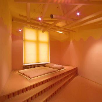 Cette chambre aux tons orangés et aux formes minimalistes vous permettra de succomber à la détente absolue. La chambre est également disponible pour des sessions photo / vidéo.