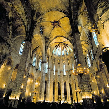 Voici l'un des plus beaux témoignages de l'art gothique catalan. Construite au XIVe siècle, l'église Santa Maria del Mar est l'œuvre de l'architecte Berenguer de Montagut. A l'origine, elle sert de lieu de culte aux marchands et armateurs de Barcelone. Vue de l'extérieur, la basilique présente un aspect massif, où prédominent les lignes droites. Sa nef centrale, extrêmement spacieuse, attire le regard par ses majestueuses colonnes octogonales. A ne pas manquer également : l'immense rosace aux vitraux polychromes qui date du XVe siècle.