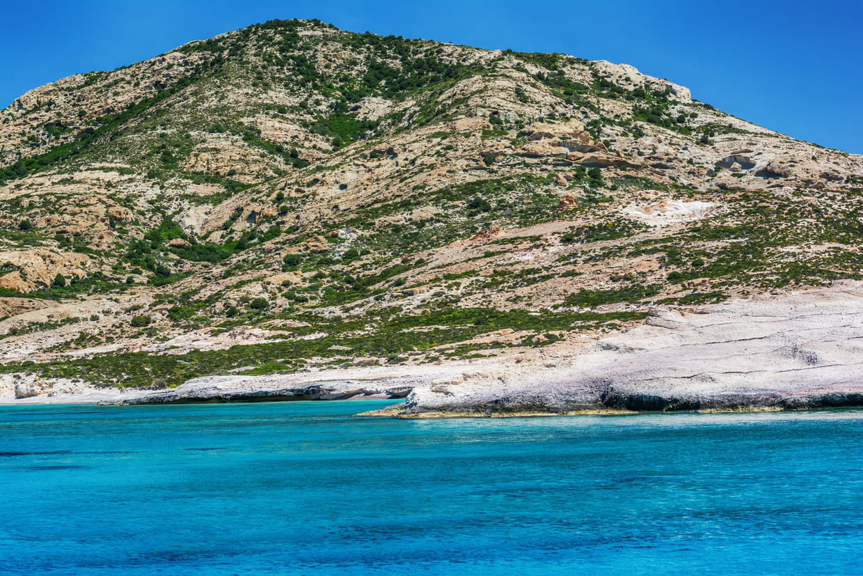 Plus grande île inhabitée des Cyclades, Polyegos est accessible en bateau depuis Milos. Au pied des falaises colorées, vous pourrez vous baigner dans les "Blue waters".