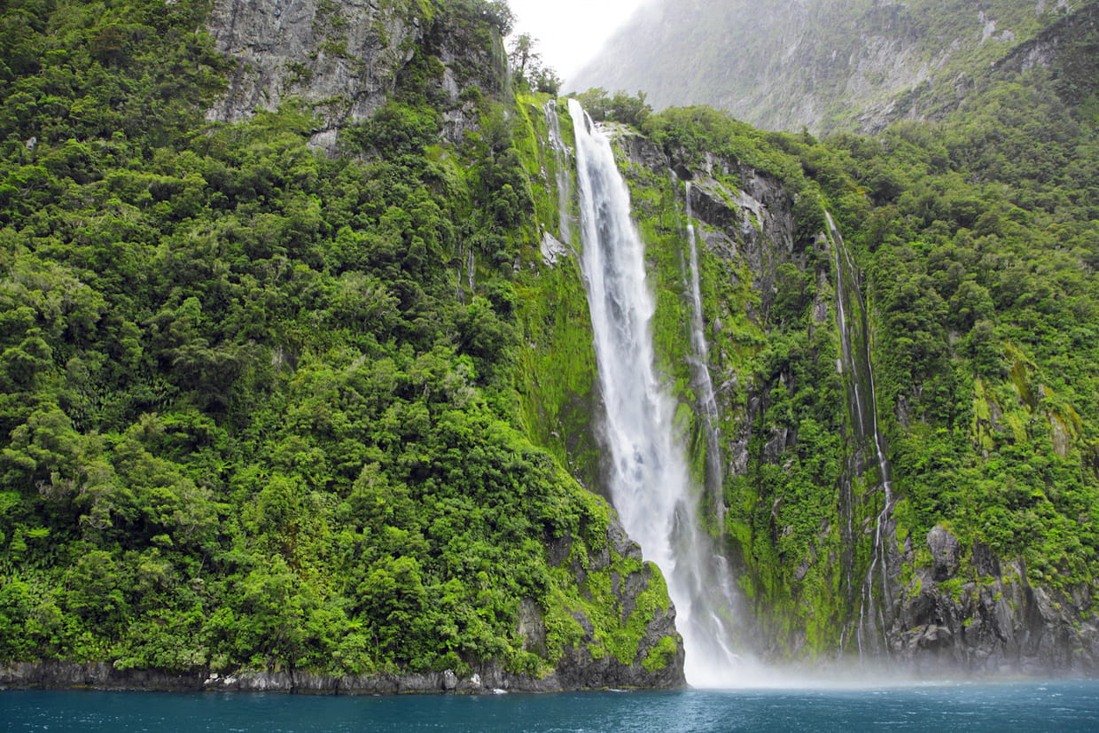 Le fjord de Milford Sound est entouré de montagnes abruptes d'où s'écoulent de nombreuses cascades. L'eau y est omniprésente que ce soit celle de la mer, des cascades, ou encore la brume environnante.