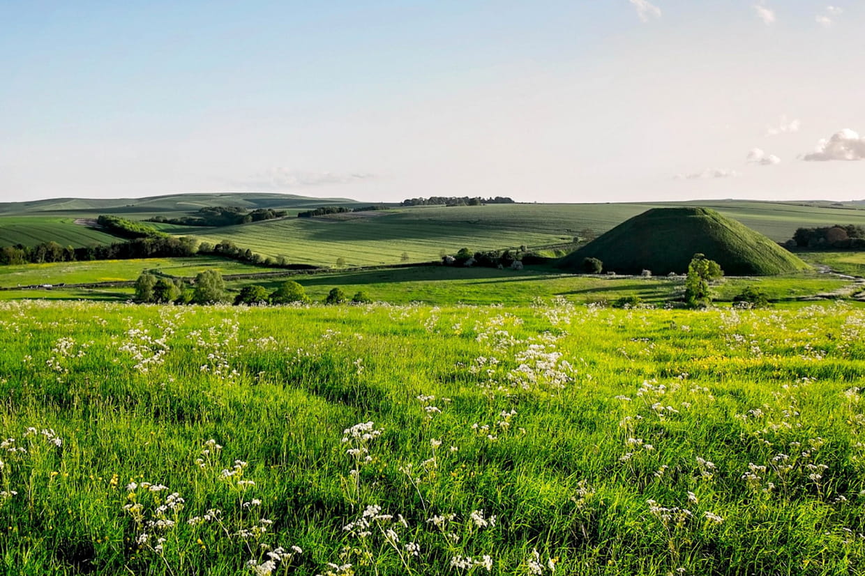 Silbury Hill, site archéologique situé à une vingtaine de kilomètres de Stonehenge affiche encore des couleurs estivales.