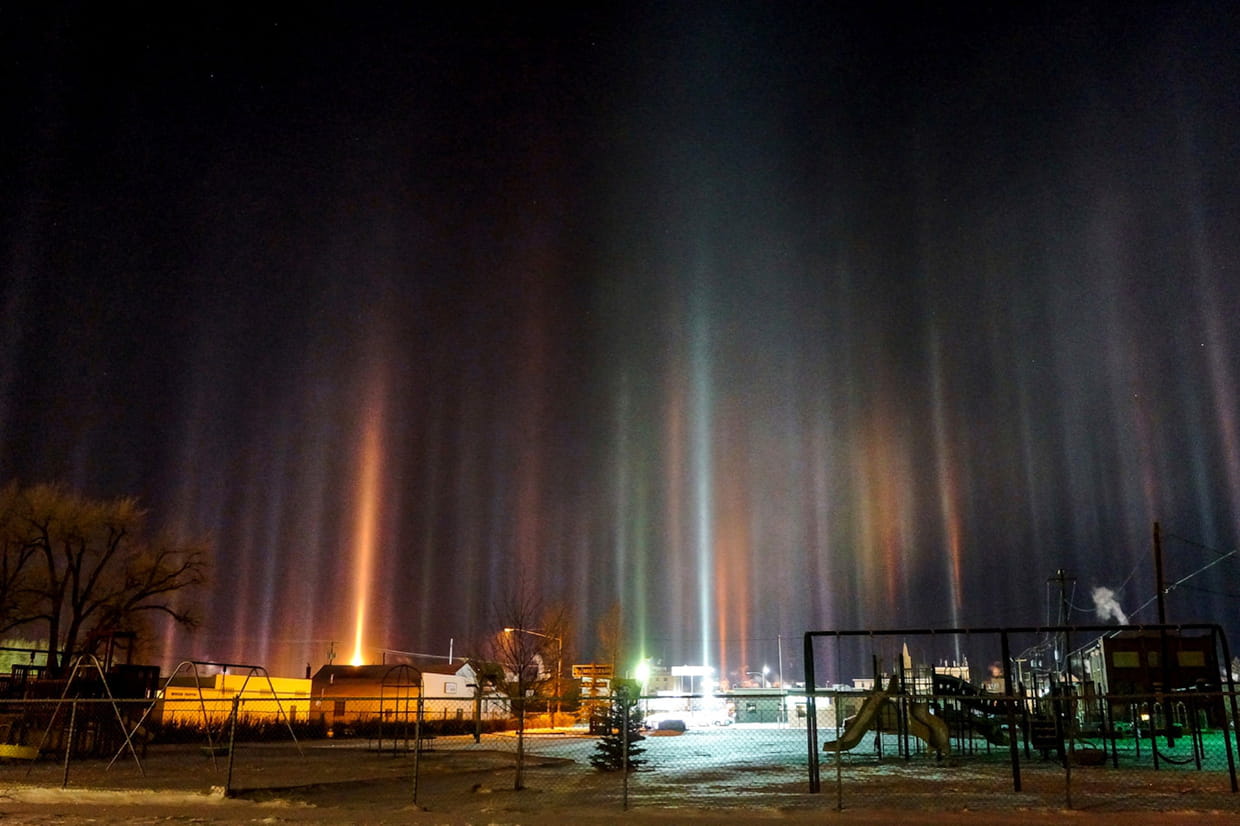 Là encore, l'appareil photo n'est pour rien dans ce phénomène optique impressionnant, visible dans les pays du nord. Les cristaux de glace présents dans l'air provoquent ces magnifiques piliers de lumière.