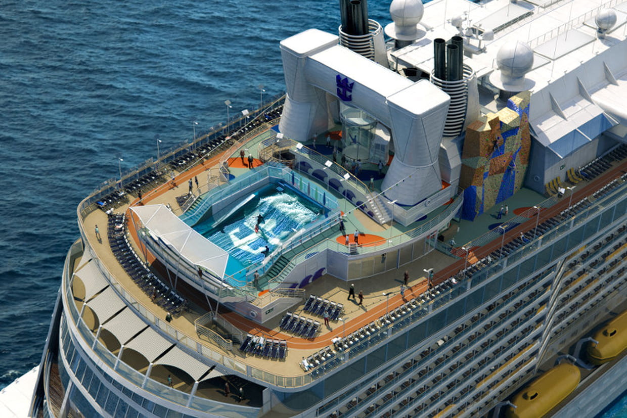 Le Quantum of the Seas chouchoute les amateurs de sensations fortes et prévoit même sur son pont arrière un practice de surf en faisant appel à la technologie du simulateur FlowRider.