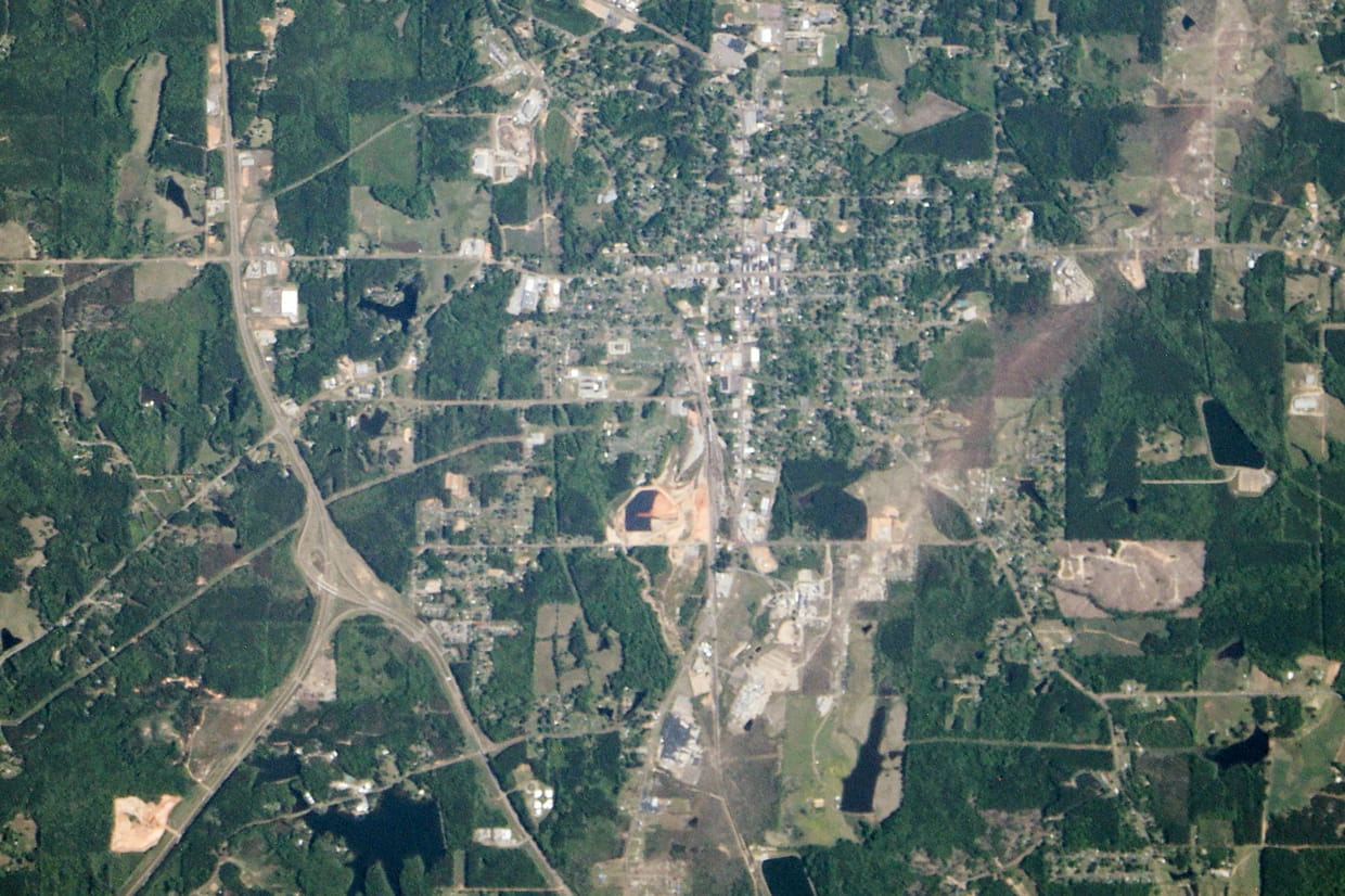 Le 28 avril 2014, un tornade a traversé Louisville dans le Mississippi. On distingue très nettement les traces de la tornade sur ce cliché pris depuis la station spatiale ISS.