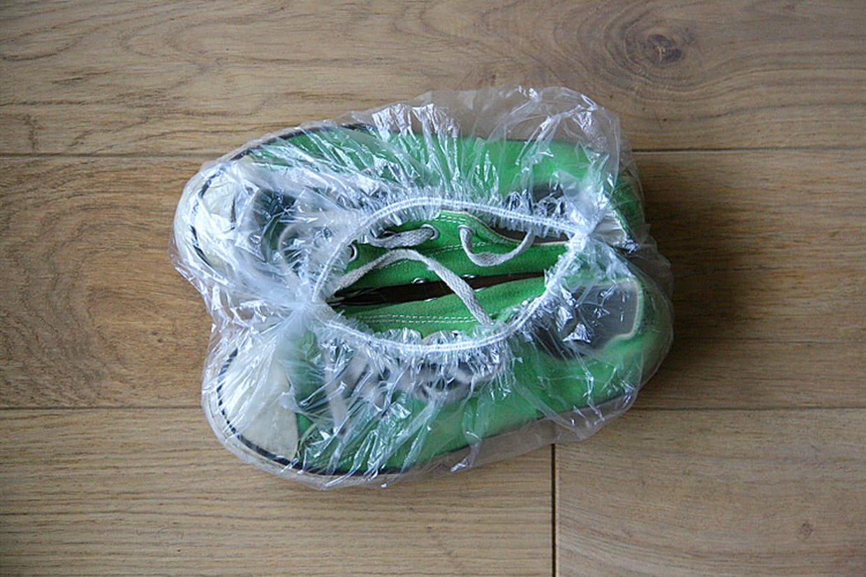 Pas très hygiénique de mélanger chaussures et vêtements dans une même valise. Pour protéger le linge, on glisse ses vieilles baskets dans un bonnet de douche jetable, la plupart du temps proposés dans les hôtels. Le tour est joué !
